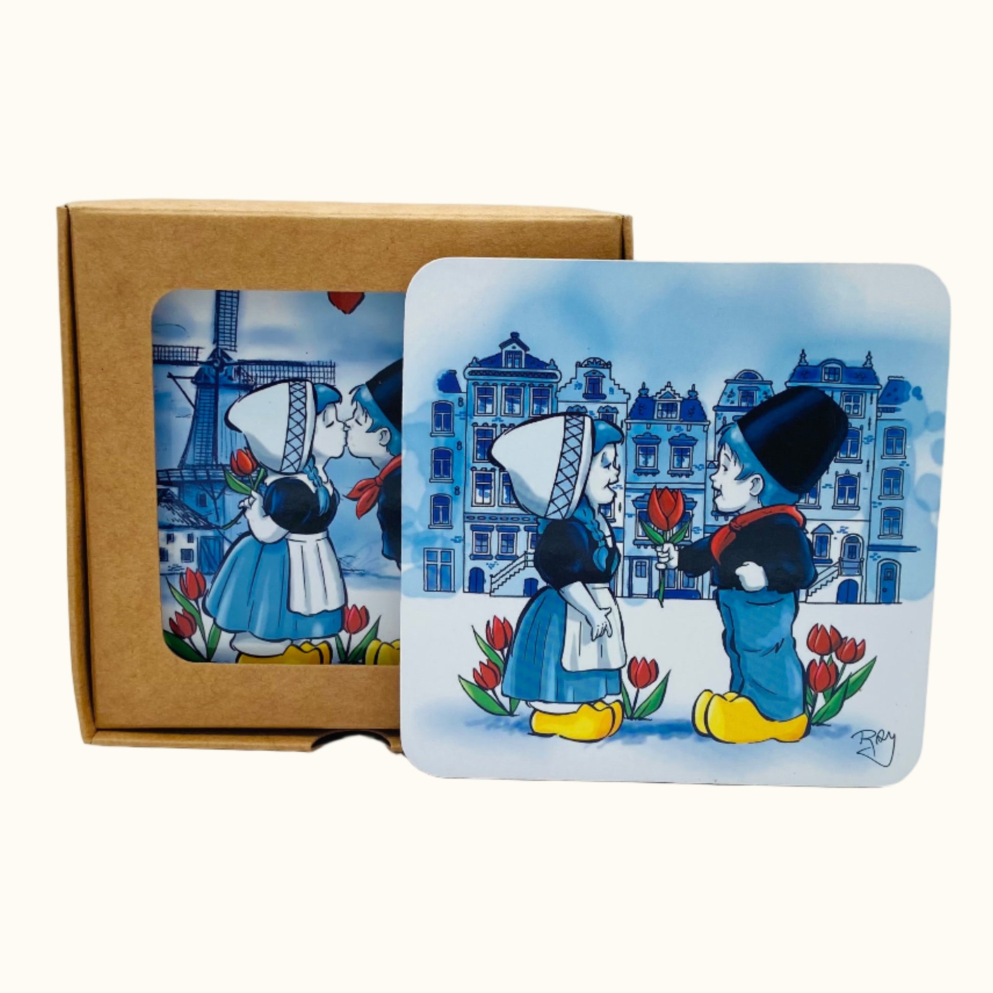 Four coasters showing the classic Dutch kissing couple. Packed in a rustic craft box.