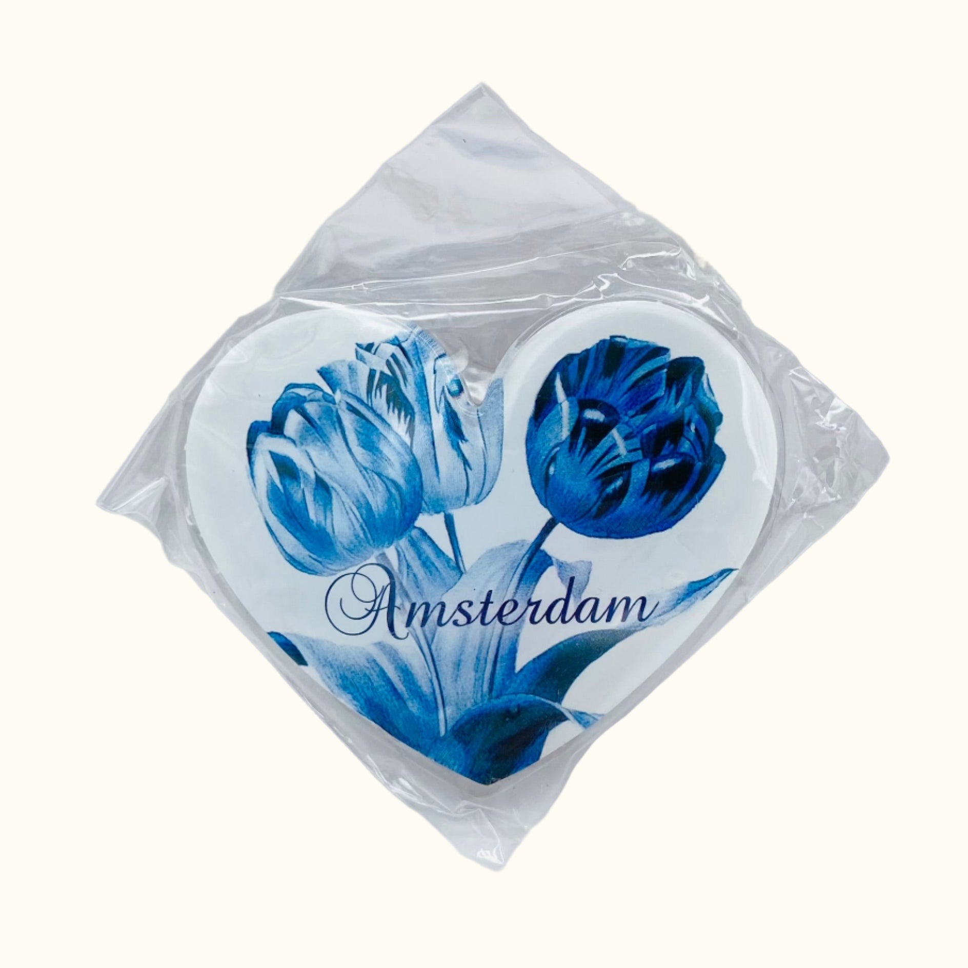 A charming fridge magnet celebrating Amsterdam and tulips. Great for travelers and collectors.